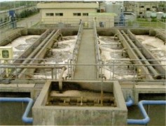 污水處理流程 : 攔污柵、曝氣沉砂池、生物曝氣池、終沉池、消毒、放流